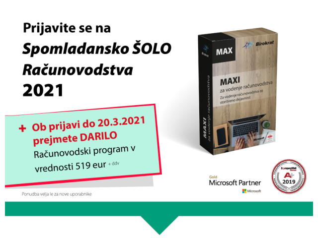 Izberite celotno šolo računovodstva do 22.4.2021 in za DARILO prejmete računovodski program Birokrat MAXI v vrednost 519,50 eur + ddv.
