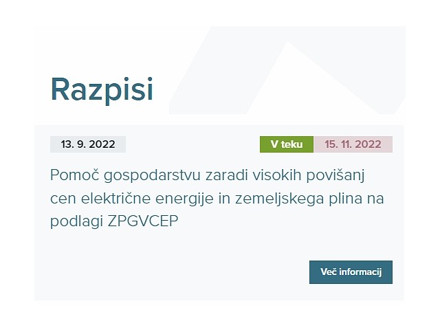 Vsi pogoji za oddajo vloge in dodelitev sredstev so določeni z Zakonom o pomoči gospodarstvu zaradi visokih povišanj cen električne energije in zemeljskega plina (ZPGVCEP) (http://www.pisrs.si/Pis.web/pregledPredpisa?id=ZAKO8666), zato podjetja opozarjamo, naj ne pričakujejo posebnega javnega razpisa.