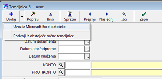»Glavna knjiga – Odpiranje temeljnic – vrsta temeljnice: ročno knjiženje«, vpišite datum, opis in komentar - in vnos potrdite z gumbom »Dodaj«. Pojdite na »Vnos in pregled temeljnice«.