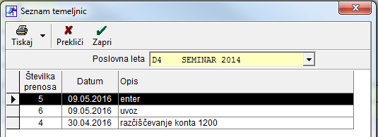 Odpre se okno »Seznam temeljnic«, ki prikaže vse temeljnice z vrsto temeljnice: »Ročno knjiženje«. Izberite temeljnico, iz katere želite kopirati podatke in kliknite gumb »Zapri«.